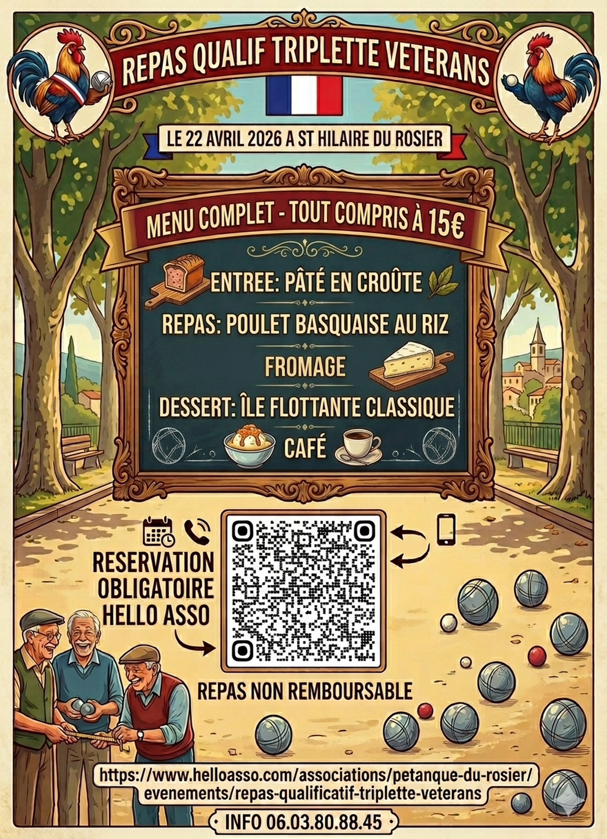 À l'occasion du concours pré-fédéral Triplette Vétéran, l'Association Pétanque du Rosier vous convie à un repas complet servi le midi.