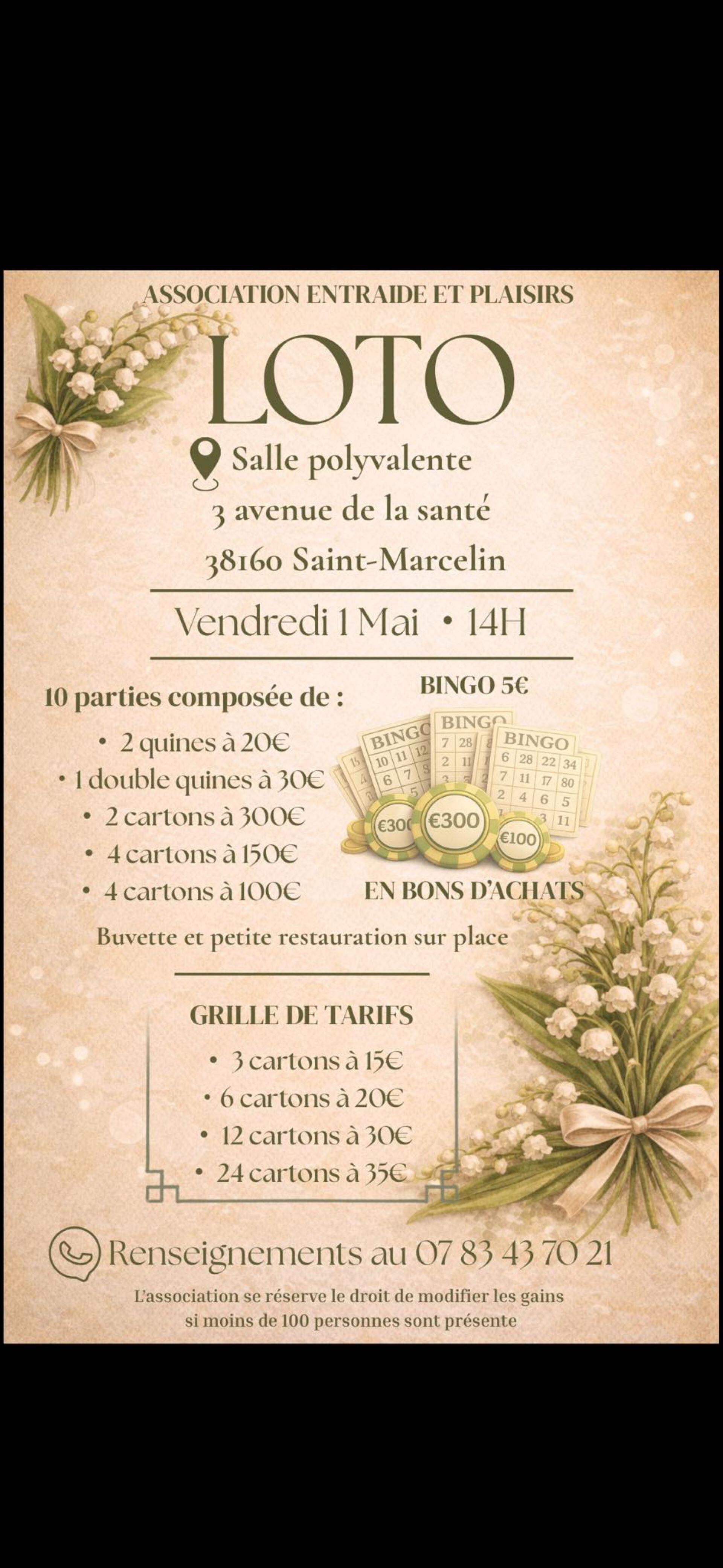 Venez participer au loto organisé par l'Association Entraide et Plaisirs. Au programme, 10 parties avec de nombreux lots à gagner sous forme de bons d'achats, incluant des quines et des cartons. Une buvette et un service de petite restauration seront disponibles sur place pour agrémenter votre après-midi. L'association se réserve le droit de modifier les gains si moins de 100 personnes sont présentes.