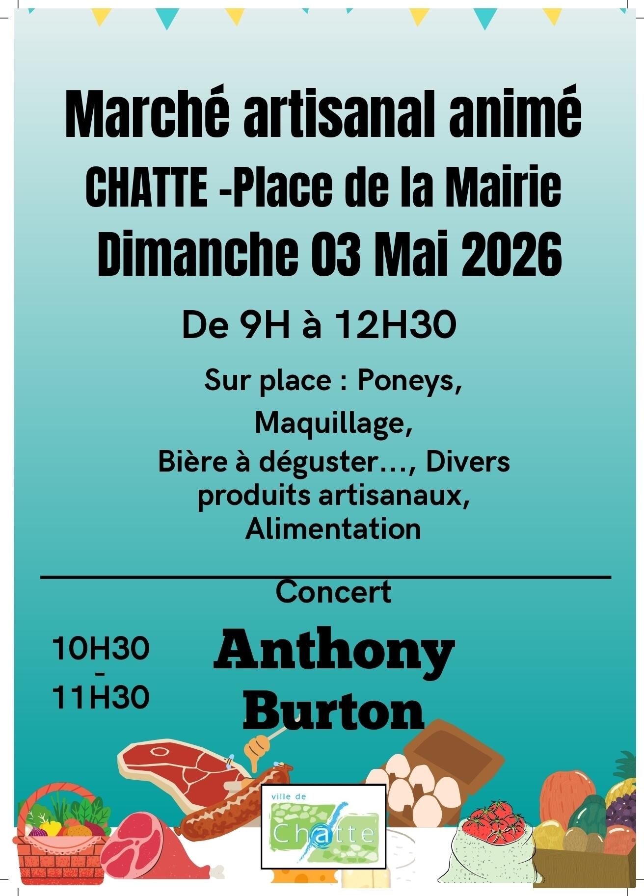 Dimanche 3 mai 2026 de 9h à 12h30.Concert Anthony Burton de 10h30 à 11h30.