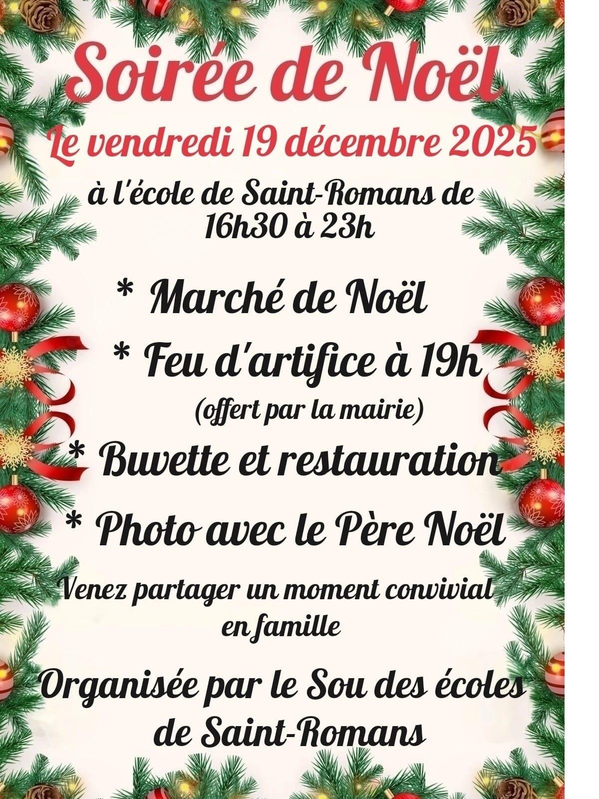 Le Sou des écoles de Saint-Romans organise sa traditionnelle soirée de Noël, avec comme nouveautés un marché de Noël de 16h30 à 23h, présence d'artisans, créateurs et producteurs locaux.