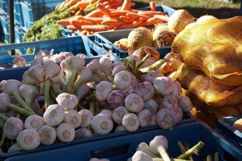 Petit marché de producteurs avec boucherie, fromages, fruits et légumes.